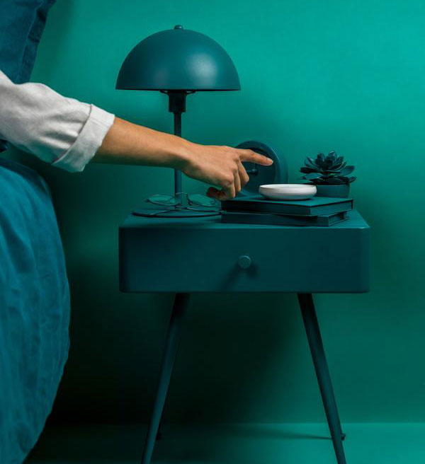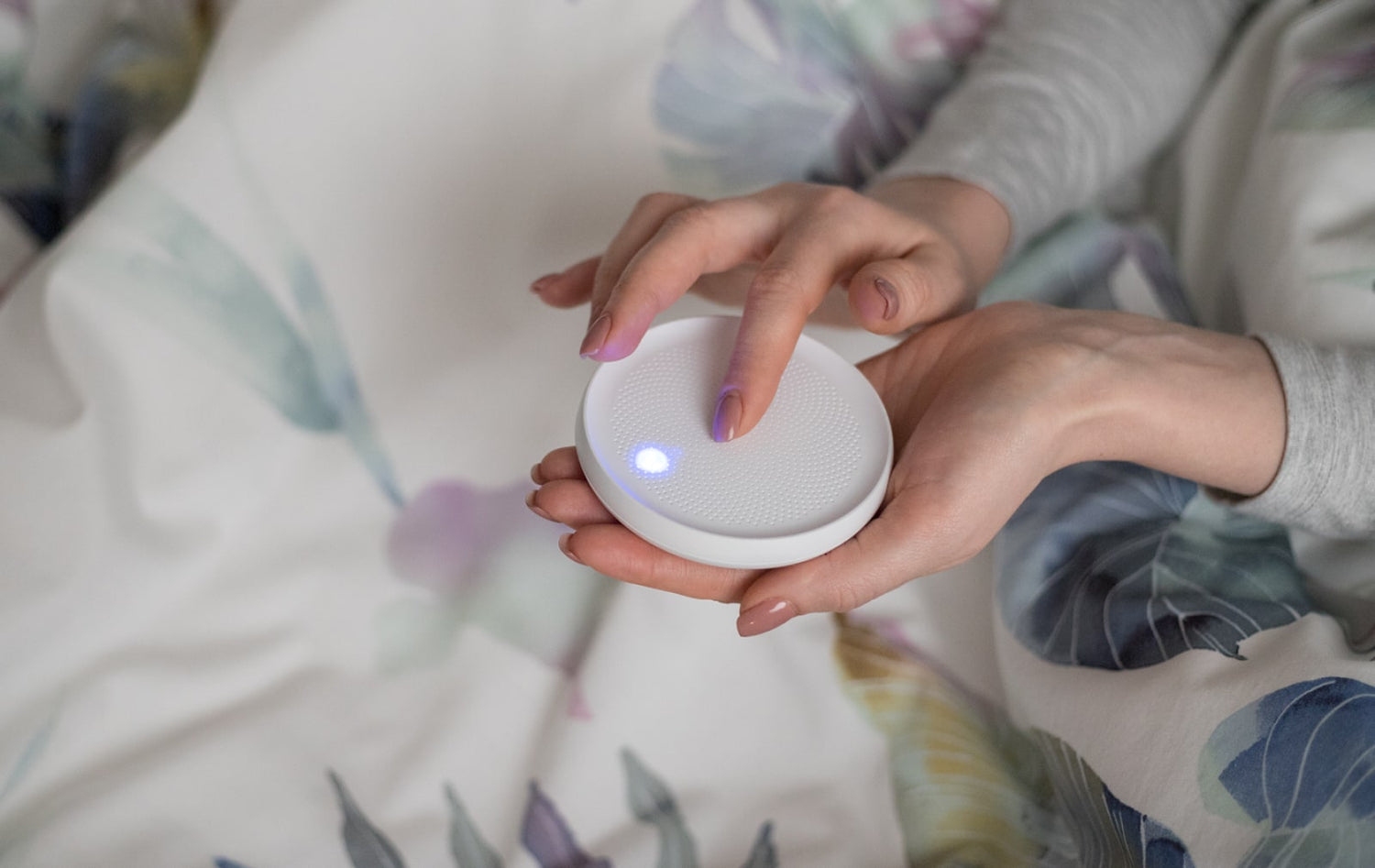 The DoDow lamp projects a glowing, pulsating blue light on the ceiling—you coordinate your breathing to the dynamic light changes.